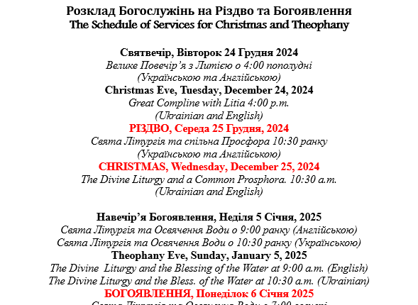 The Schedule of Services for Christmas and Theophany
