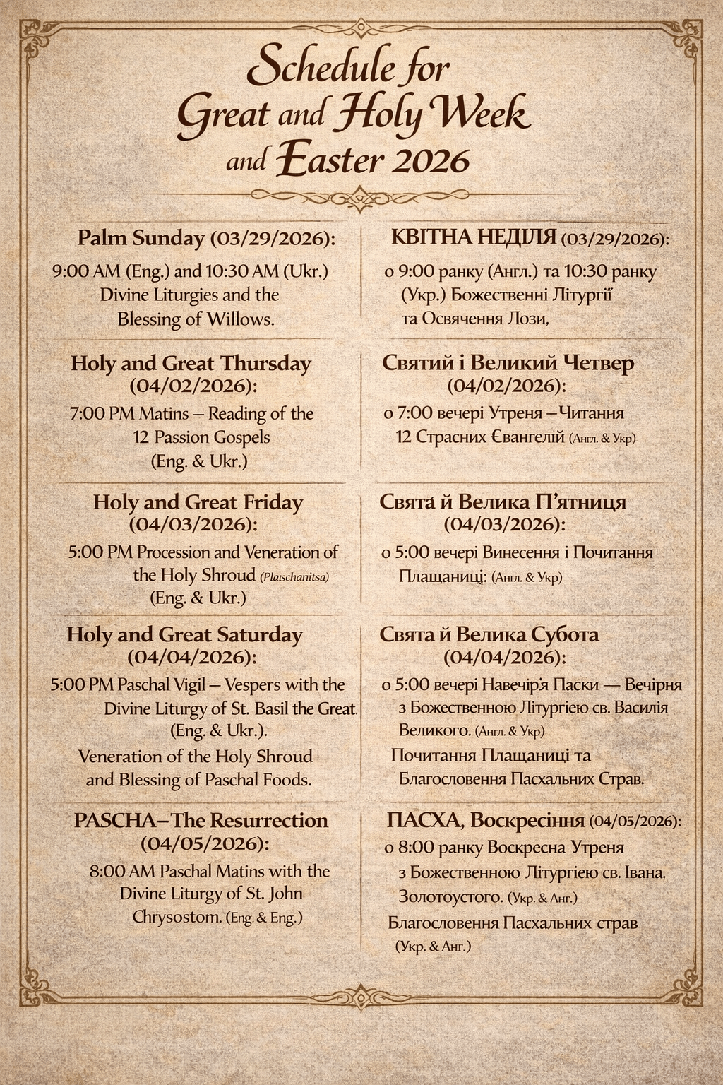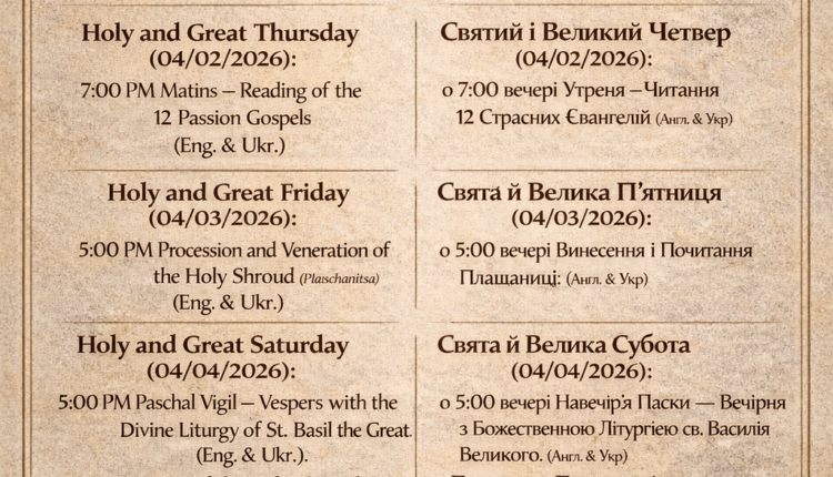 Свята й Велика Субота (04/04/2026): о 5:00 ввечері Навечір’я Пасхи – Вечірня з Божественною Літургією св. Василія Великого. (Англ. & Укр) Почитання Плащаниці та Благословення Пасхальних Страв.